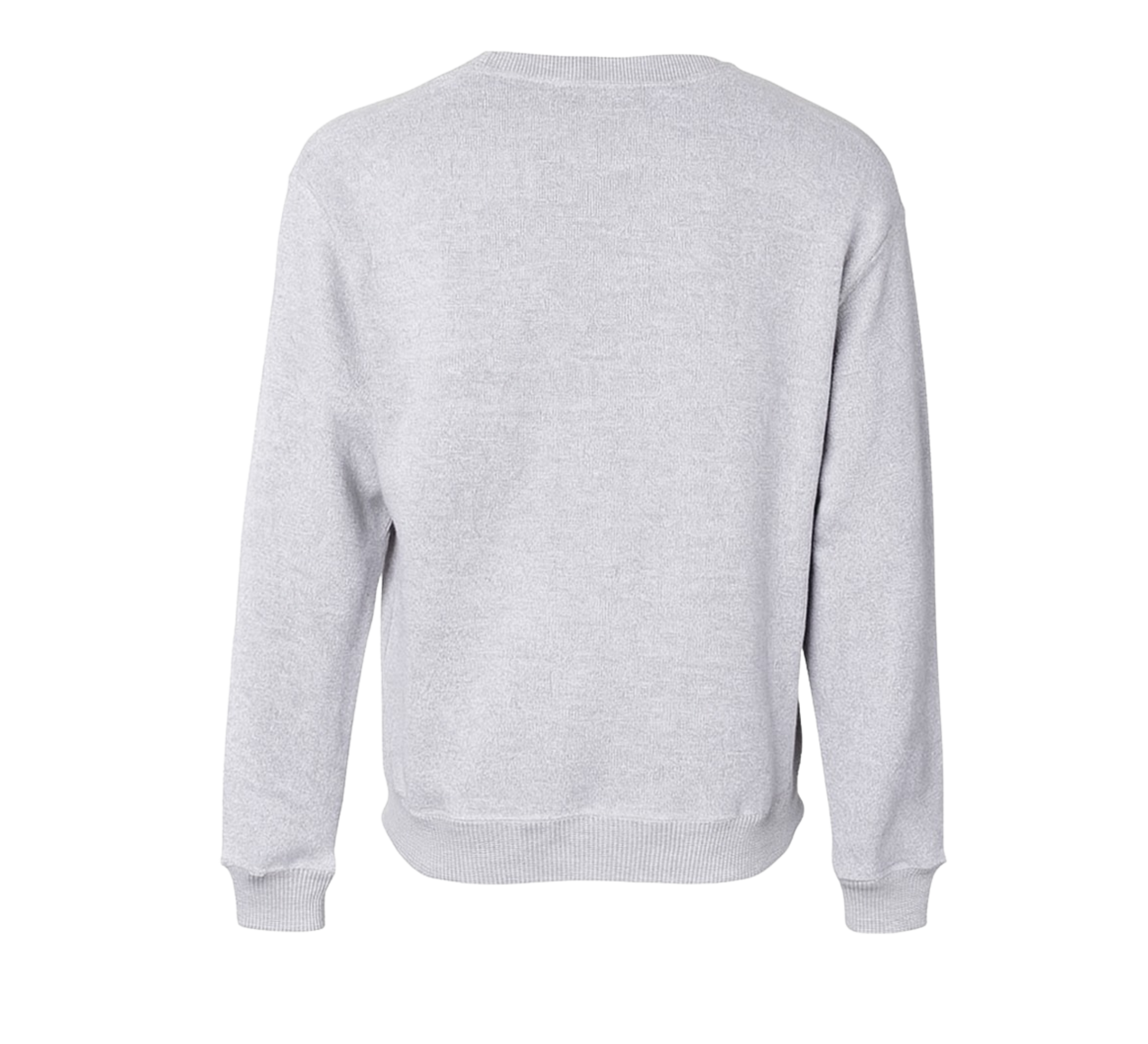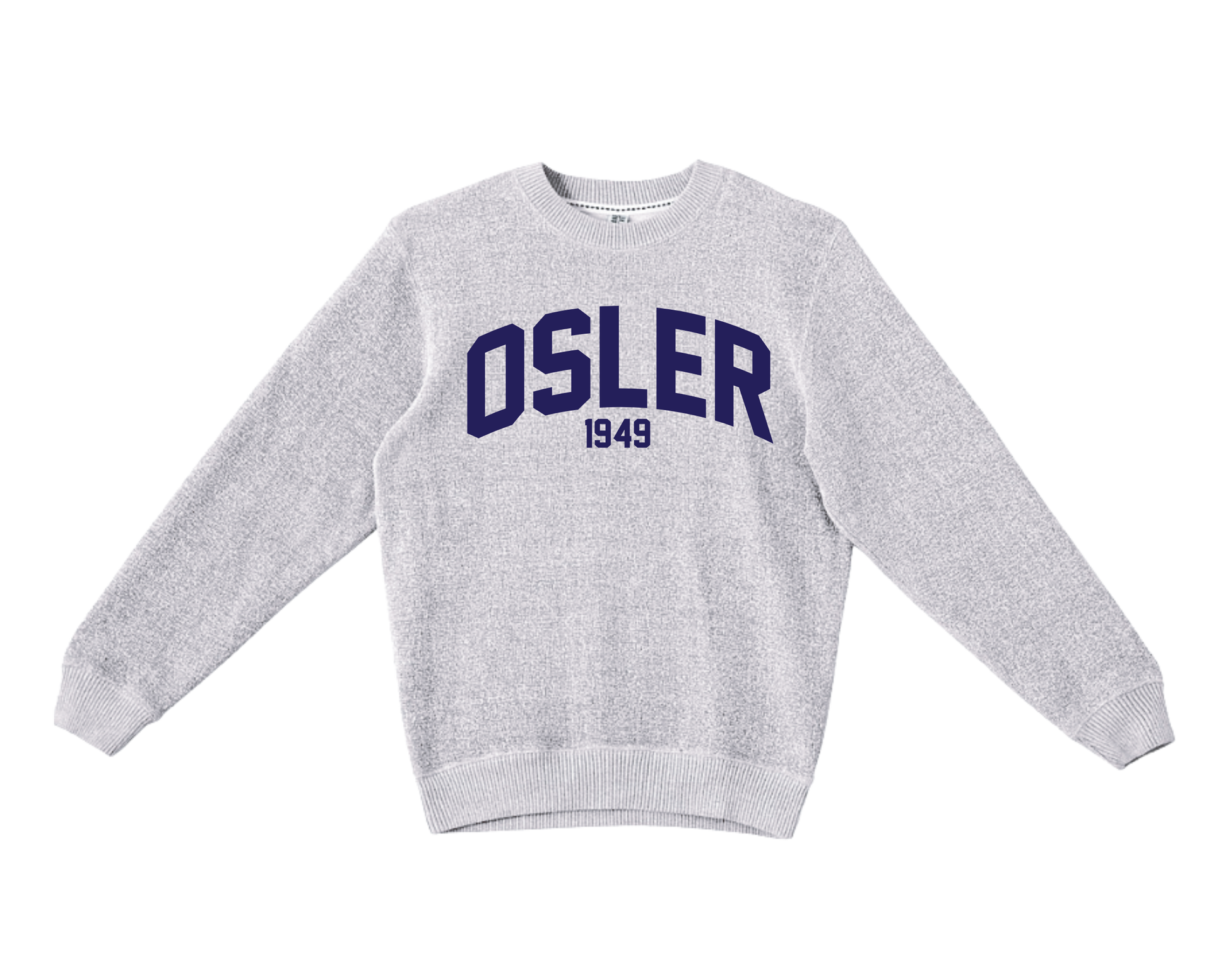 Salt and pepper grey Nantucket Crewneck Sweatshirt with a crested applique navy blue Osler text.