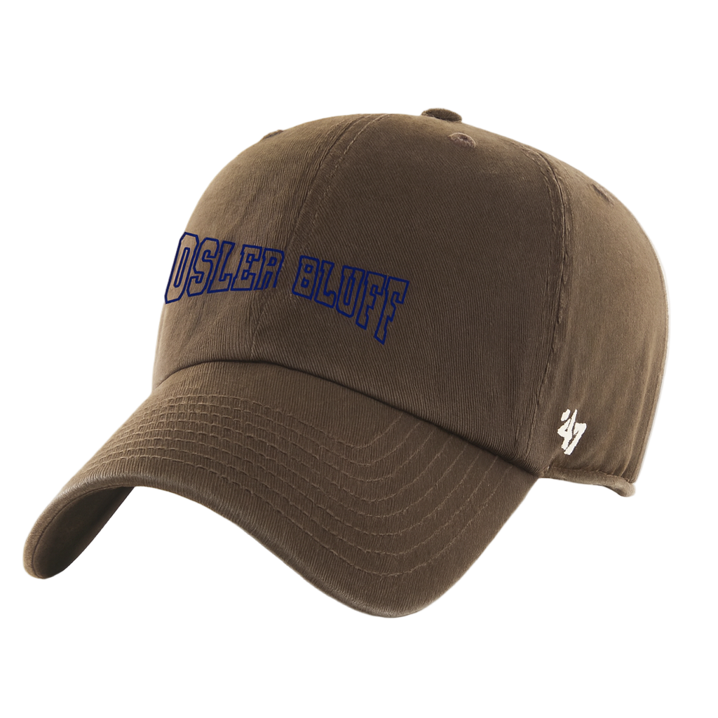 This brown Hard Hat ’47 CLEAN UP is a relaxed and curved cap crafted from cotton twill featuring Osler Bluff text on the front in navy blue, and an adjustable strap closure.